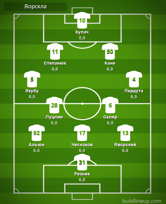 «Ворскла»: Резник – Альюн, Чеснаков, Яворский – Якубу, Пуцлин, Скляр, Пердута – Степанюк (Ребенок, 66), Кане – Кулач (Васин, 66).