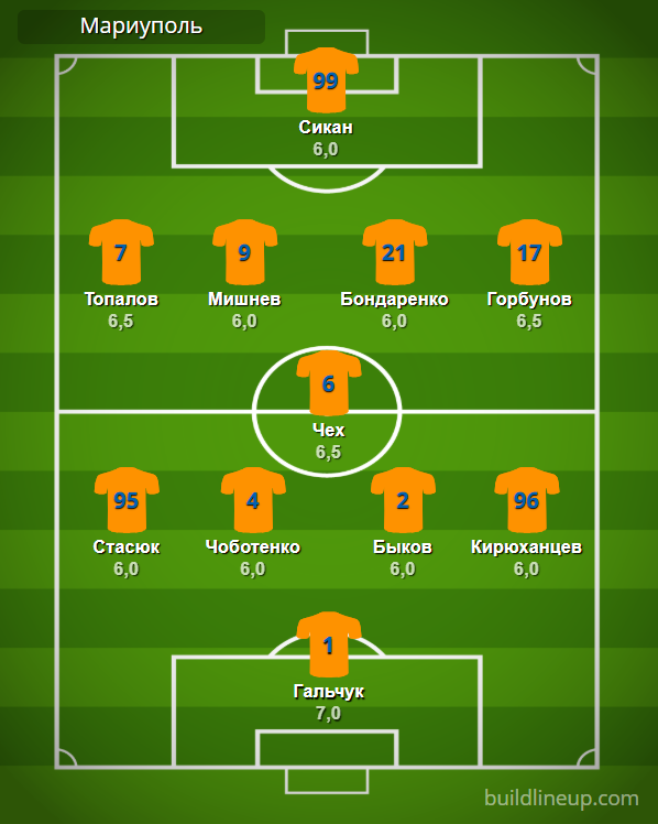«Мариуполь»: Гальчук – Стасюк, Чоботенко, Быков (Игнатенко, 81), Кирюханцев – Чех – Топалов (Петерман, 81), Мишнев, Бондаренко, Горбунов (Кащук, 69) – Сикан (Кулаков, 62).